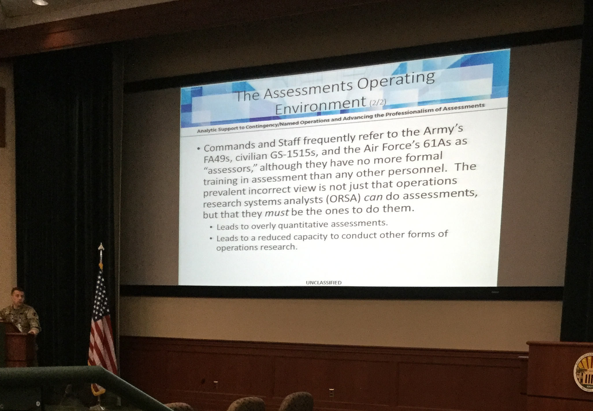 Dr. Ben Connable of RAND gave a great keynote presentation to kick off the third day of the Analytic Support to Contingency/Named Operations and Advancing the Professionalism of Assessments special meeting at MacDill Air Force base. He described how ORSAs, who conduct analyses, are also asked (almost by default) by leaders to conduct assessments at the tactical, operational, and campaign levels. Ben was followed up by meeting co-chair LTC Marv King, who talked about the current state and future of assessments.