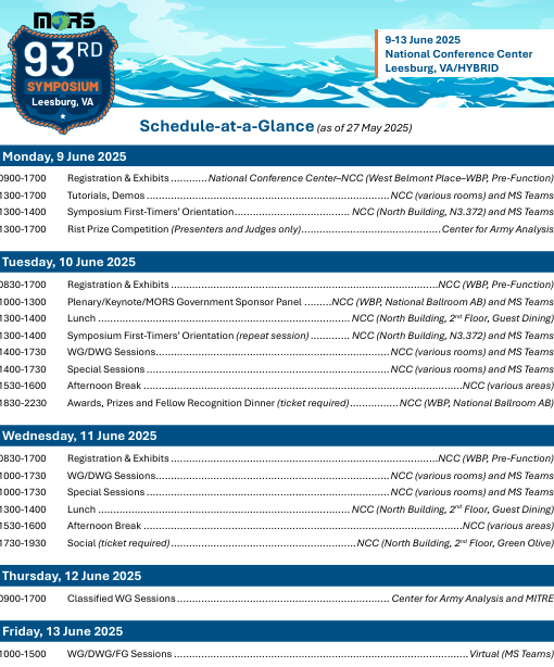 For over 55 years, the annual MORS Symposium has been the premier opportunity for the national security community to exchange information, examine research and discuss critical national security topics. Held in notable locations, the Symposium gathers over 800 OR and analytic professionals from military, government, industry and academic ranks to share best practices and enjoy a bit of well-deserved peer-to-peer networking in a supportive environment.